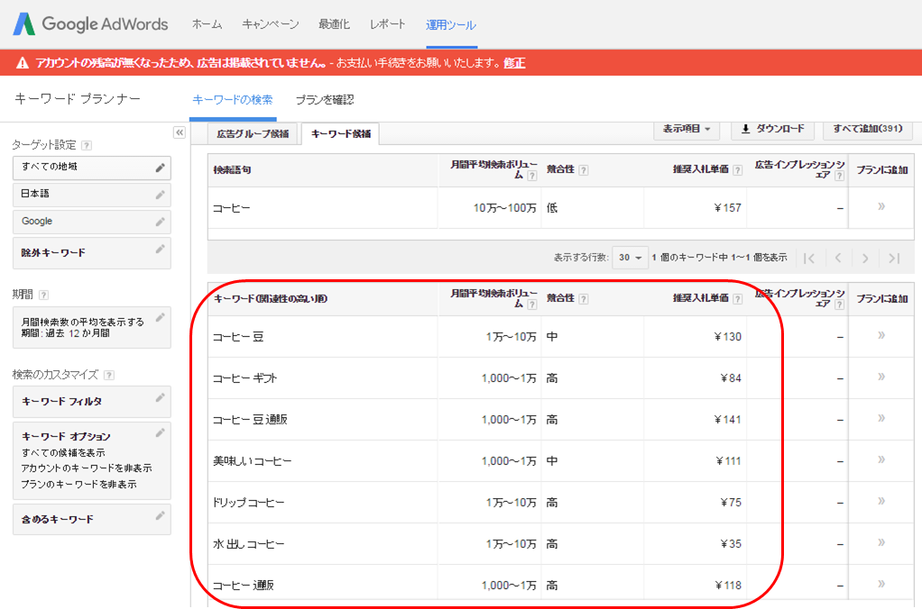 キーワードプランナーも、もともとは広告の設置用に作られているので、広告契約をサジェストするような余分な機能が沢山ついています。